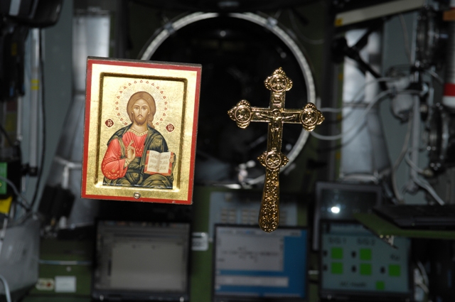 На станции есть Распятие. Это благословение Патриарха Алексия II экипажа 13-й экспедиции на МКС, который и доставил Крест на борт станции. Святейший Патриарх Кирилл в 2011 году благословил экипаж МКС Казанской иконой Божией Матери.