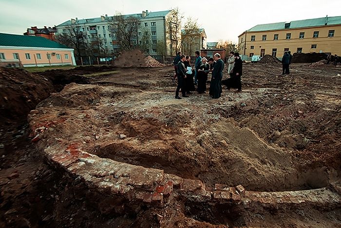 Строители демонтировали часовню, стоявшую на месте разрушенного в 1930-е годы храма. Под снятым слоем грунта обнаружены фрагменты его основания и алтарной стены.