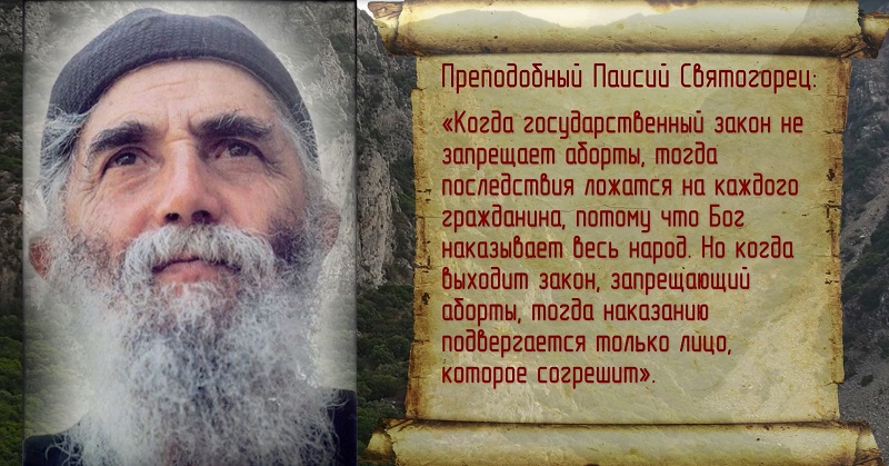 И после отшествия ко Господу в 1994 году, и при своей земной жизни преподобный Паисий пользовался непререкаемым духовным авторитетом как у простых жителей Греции, так и у известных людей, приверженных вере Христовой. Многие из последних искали у знаменитого афонского подвижника ответ на вопрос как остановить великое зло современного мира - детоубийство (аборты). Преподобный Паисий Святогорец описал одному греческому депутату как политикам, медицинским работникам и Церкви следует организовать современную кампанию за жизнь, по законодательному запрету абортов.
