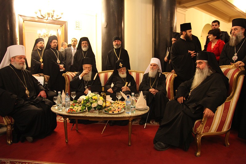 Слева направо: митрополит Чешских земель и Словакии Христофор, Патриарх Константинопольский Варфоломей, Патриарх Грузинский Илия II, Патриарх Сербский Ириней, митрополит Варненский и Великопреславский Кирилл