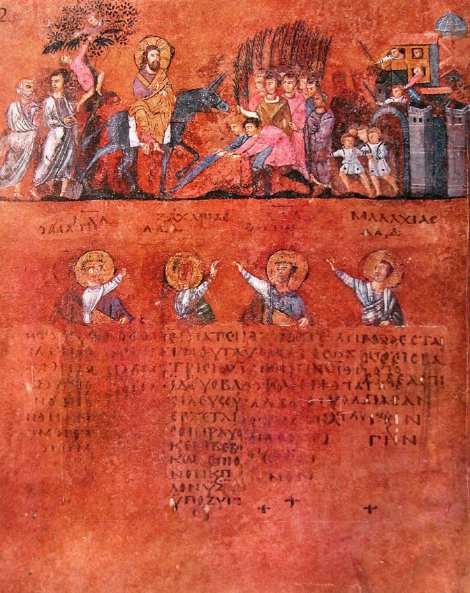 Вход Господень в Иерусалим. VI в. Миниатюра Евангелия из Россано. Музей в Россано, Италия