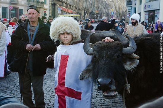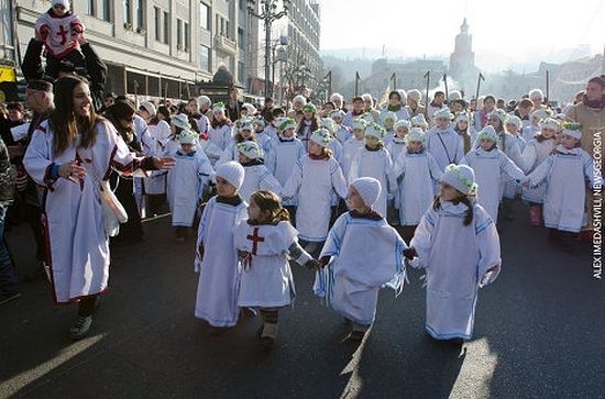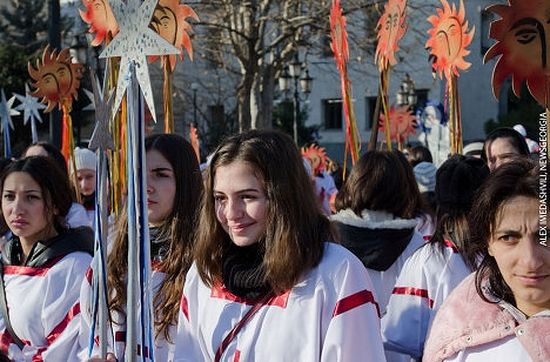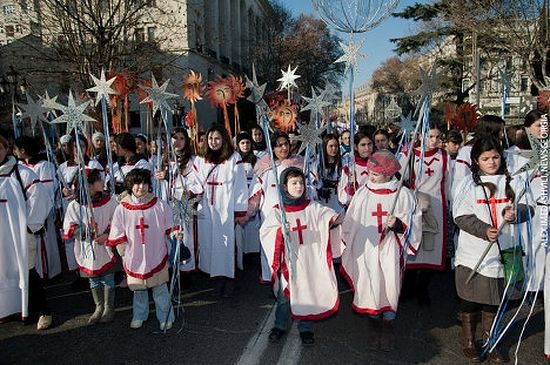 Главными участниками массового шествия, в котором принимают участие тысячи человек, являются "несущие благую весть" - в основном это дети, одетые в белые одежды с изображенными на ней красными крестами. Они песнопениями оповещают о рождении Христа, пишет NewsGeorgia