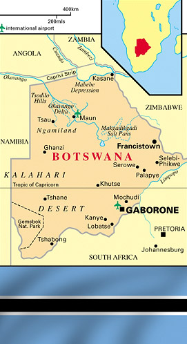 Местоположение: Южная Африка; граничит на западе с Намибией, на севере с Замбией, на востоке с Зимбабве, на юге с ЮАР. Площадь: 600 370 км2. Численность населения: 1 815 508 человек (по состоянию на июль 2007 года). Официальный язык: английский; распространены языки сетсвана (78,2%) и каланга (7,9%). Краткая история страны. Около 80% населения страны составляют племена народности тсвана. Они считают, что произошли от народа, которым правил вождь Масило, живший в середине XVII века. Его сыновья и внуки основали в конце века королевство Нгвакетсе, подчинив себе другие племена. В начале XIX века эта страна была вовлечена в череду кровопролитных войн, вызванных усилением зулусов, что привело к миграции многих народов. В середине XIX века тсвана покорили бушменов и заняли принадлежавшие им области. Позднее ухудшились отношения тсвана с живущими в Трансваале африканерами (потомками голландских поселенцев XVII века), из-за чего в 1876 году великий вождь Кхама III и другие влиятельные вожди обратились к представителю Великобритании с просьбой принять народ тсвана под британское покровительство. В ответ на эту просьбу через два года были присланы английские войска, но когда они ушли три года спустя, в Ботсвану вторглись африканеры. В 1885 году Великобритания победила африканеров, и, с согласия Кхамы, вся территория, населенная народом тсвана, была объявлена протекторатом Великобритании под названием Бечуаналенд.