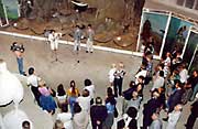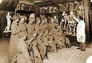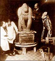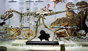 Далее следует зал "Происхождение человека", важное место в котором занимает стенд с двумя наборами черепов - обезьяньи (разных видов) и человеческие. Без какой-либо подготовки сразу же видно, где какой череп, поскольку у всех обезьян (в отличие от людей) система "челюсти-зубы-нос" существенно выдвинута вперед (как у собак). НИКАКИХ ПРОМЕЖУТОЧНЫХ форм черепа не экспонируется. Имеется, правда, плакат, на котором даны названия предполагавшихся "предков" (синантроп, питекантроп, яванский человек, австралопитек) и сообщается, что соответствующие материальные подтверждения "фрагментарны и не вполне достоверны". Например, "пилтдаунский человек", бывший в первой половине 20 века главным "кандидатом в предки", оказался сфальсифицированным с помощью напильника из челюсти гиббона и человеческих зубов, обработанных для придания им "более древнего вида" хромовыми квасцами (считается, что эту тонкую подделку организовал "всемирно известный мыслитель" и палеонтолог иезуит Тейяр де Шарден). Разумеется, никогда не было находок даже половины черепа "обезьяночеловека" и все рассуждения основываются на малых фрагментах разрозненных костей (причем найденных в разных слоях). Зато есть скульптурная (из металла черного цвета) группа "первобытных" людей, мускулистых, сильно обросших и достаточно свирепых, но вполне походящих на современных туристов, проживших месяц в тайге.