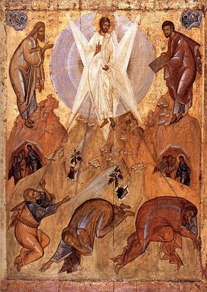 В течение Своей земной жизни только однажды, перед тремя избранными учениками, в той мере, насколько они могли вместить таинственное для них откровение, Господь явил истинное величие и славу Своего совершенного обоженого человеческого естества и, тем самым, засвидетельствовал добровольность Своего уничижения. В кондаке праздника Преображения Господа хорошо раскрыты оба этих аспекта: «На горе преобразился еси, и якоже вмещаху ученицы Твои, славу Твою, Христе Боже, видеша; да егда Тя узрят распинаема, страдание убо уразумеют вольное, мирови же проповедят, яко Ты еси воистину Отчее сияние».