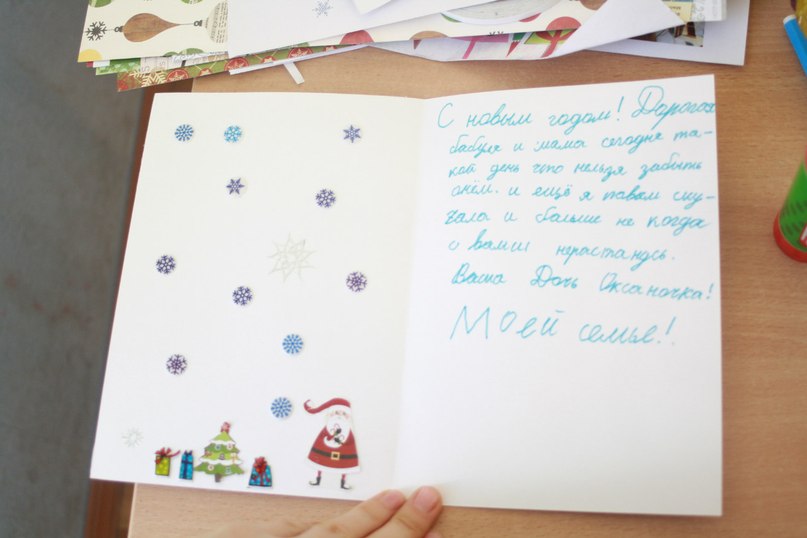 Мы готовим рождественские подарки, вырезаем праздничные открытки. Оксана уже украсила свою открытку снежинками и блестками, и теперь пишет внутри поздравление. Никто не дает советов, не подсказывает, она всего лишь пишет о том, что чувствует.
