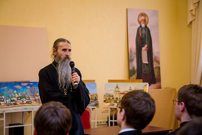 Отдельно нужно сказать о духовнике. С ним нам очень повезло, потому что нашим духовником является архимандрит Захария (Шкурихин), и.о. духовника Троице-Сергиевой Лавры. Совмещая несколько послушаний, отец Захария, конечно, не может постоянно присутствовать в гимназии, но он регулярно к нам приезжает, проводит исповедь и беседует с ребятами. Его живые, простые и в то же время глубокие слова всегда находят отклик у гимназистов, а многолетний опыт служения в священном сане делает его советы ясными и полезными. В отсутствие духовника гимназисты могут общаться не только со мной, но также и с настоятелем Варницкого монастыря игуменом Пименом и с лаврскими иеромонахами, приезжающими в монастырь, чтобы помогать в совершении ежедневных богослужений.