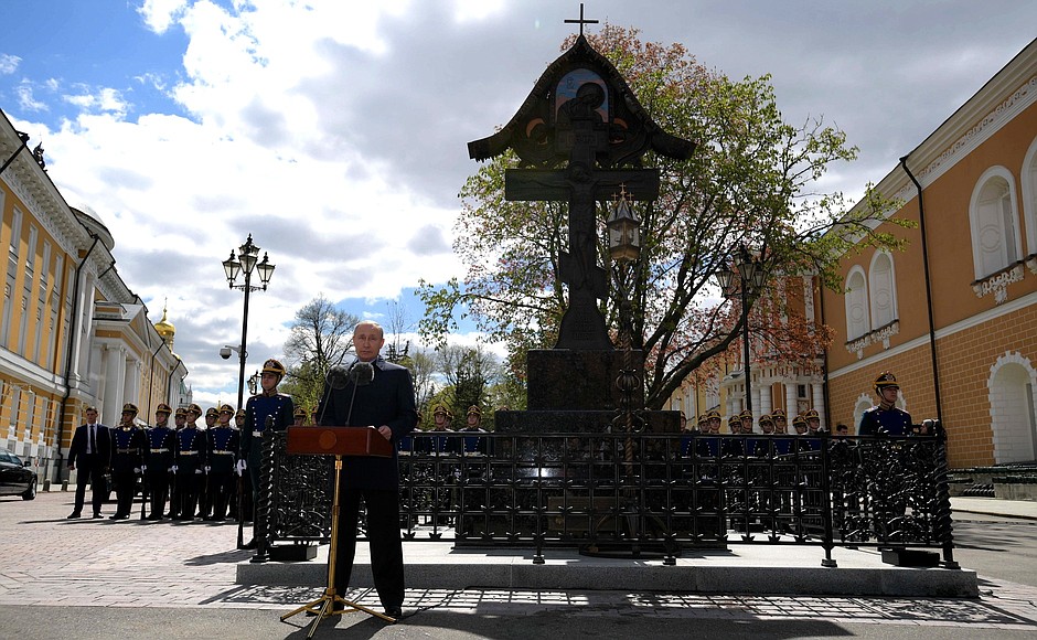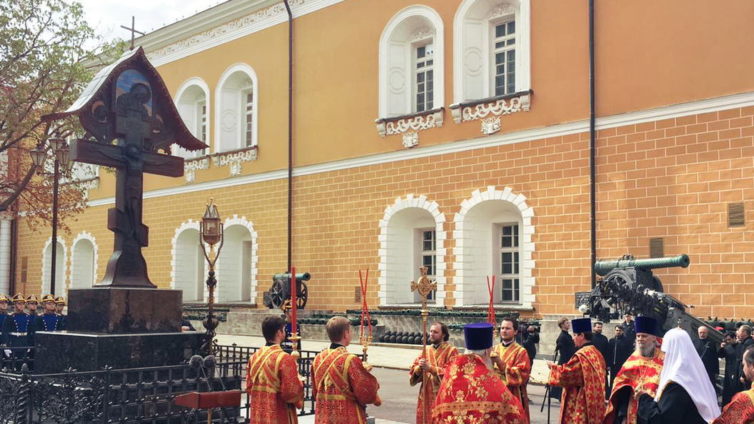 Мы сейчас совершили освящение креста, воссозданного взамен установленного на народные пожертвования нашими благочестивыми предками на месте убиения великого князя Сергея Александровича и снесенного революционной властью. Символично, что этот крест был первым памятником на территории Московского Кремля, уничтоженным после революции. Более 10 лет спустя после этого был снесен и находившийся на территории Кремля Чудов монастырь, где был погребен великий князь. Уже более 20 лет назад его останки обрели покой в Новоспасском монастыре.