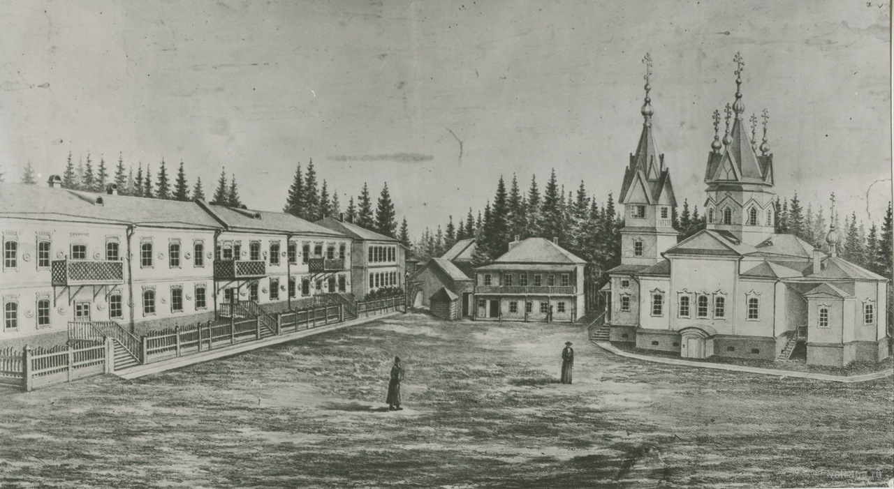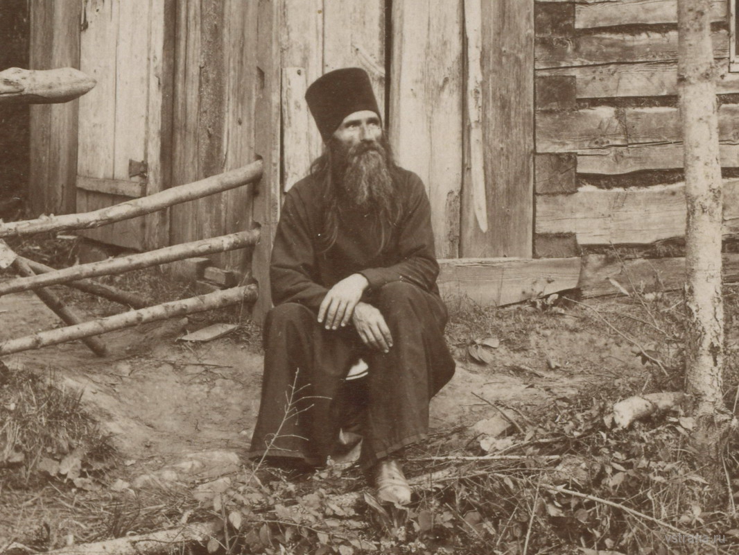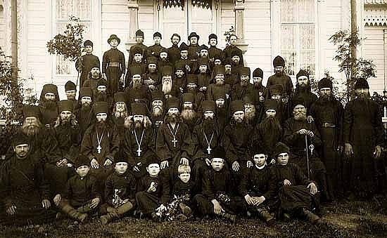 Уникальное фото 1902 года. Братия Яранского Пророчицкого монастыря. В центре запечатлелись преподобный Матфей Яранский, настоятель обители отец Нил (Пиляков, третий слева) и отец Геннадий. В первом ряду — ученики церковно-приходской школы, в двух средних рядах запечатлелись послушники монастыря. Вятский историк В.В.Низов в своем биографическом очерке о жизни старца так пишет о его жизни в то время (1899–1917 гг.): «Знавшие о. Матфея в яранский период его жизни люди вспоминают, что это был благообразный старец, роста ниже среднего. Несмотря на постоянную бледность и худобу, лицо его в старости не утратило былой привлекательности и приятности. Волосы были длинные, курчавые и седые, борода и усы — черные, позднее — с проседью. Глаза умные, проницательные, глядя на собеседника, пронзал его душу насквозь. Стремление жить страннически, достигая внутреннего монашества вниманием к себе и молчанием, наложило отпечаток на его поведение. Он постоянно тяготел к уединению, был молчалив, ходил опустив голову, погруженный в молитву. Пустых разговоров не вел, избегал шуток и смеха, праздного времяпровождения. Любопытство считал одним из самых тяжких грехов. Но за этой внешней суровостью, неприветливостью скрывались ум мудреца, по-детски доброе сердце и душа праведника.