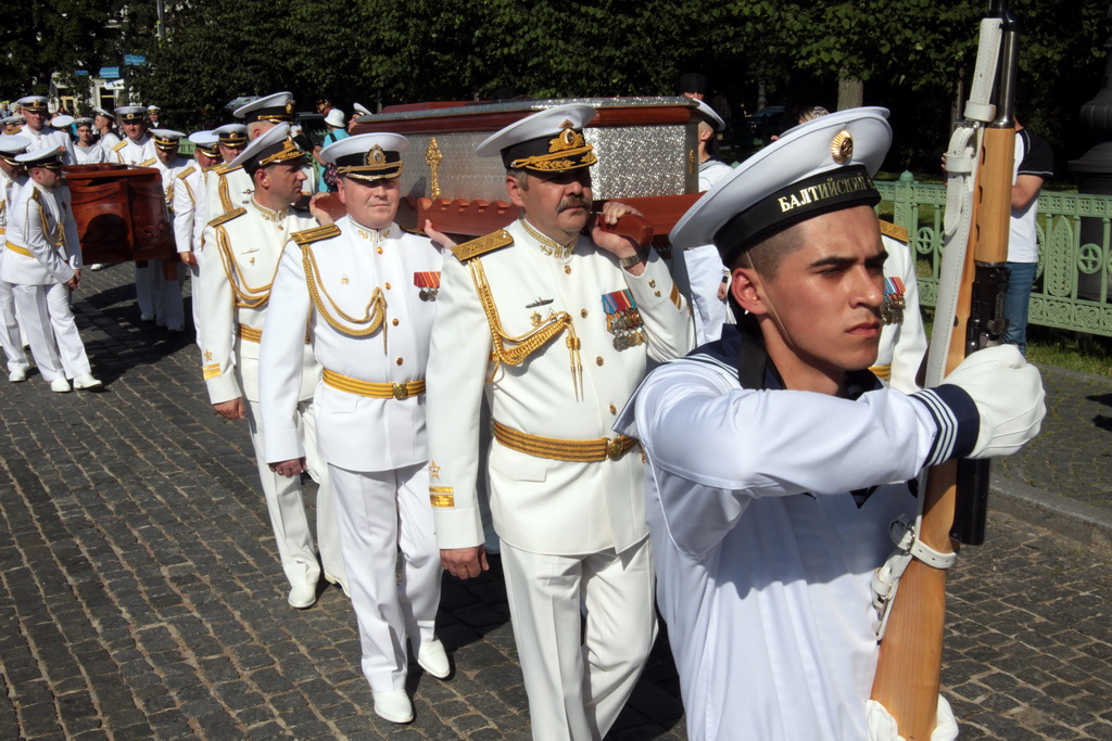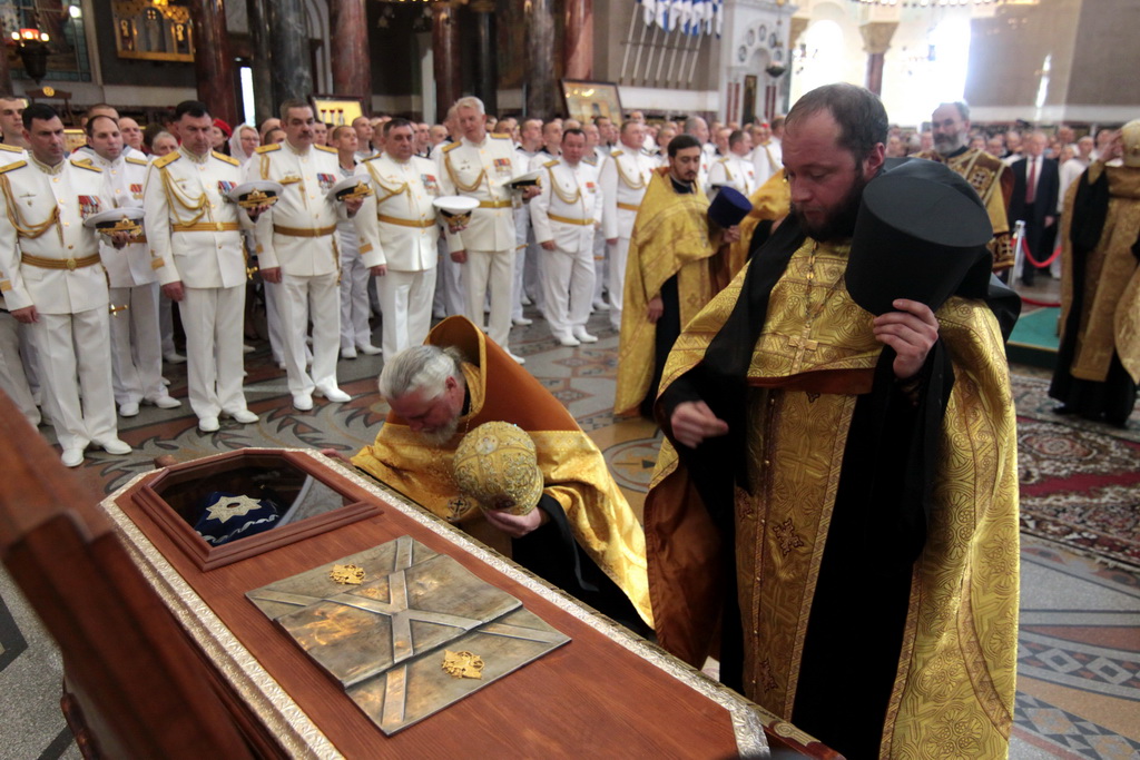 Адмиралы и офицеры ВМФ во главе крестного хода под колокольный звон принесли мощи в Морской собор, где был отслужен молебен.