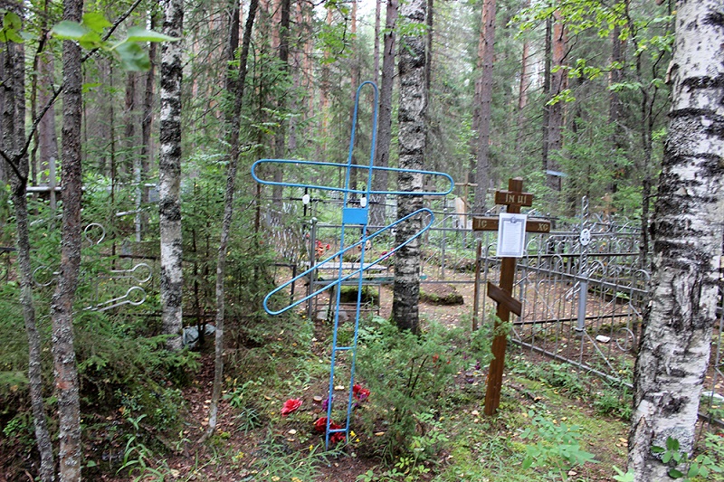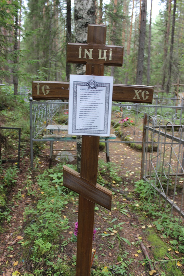 Крест на месте предполагаемого захоронения Владыки Германа со списком расстрелянных 15 сентября 1937 года членов Священной дружины Началось это путешествие для меня с посещения предполагаемого места захоронения священномученика Германа (Ряшенцева) на старом Тентюковском кладбище Сыктывкара. Последний раз вместе с супругом мы были здесь зимой. Летом могилу найти оказалось еще сложнее. К тому же путь нам преградила непролазная грязь – месиво, образовавшееся после дождя, преодолев которое пришлось еще немало времени потратить на поиск двух безымянных крестов на могилах новомучеников. К счастью, на предполагаемом месте захоронения владыки Германа и других священнослужителей сыктывкарский краевед Анна Малыхина прикрепила ламинированный листок бумаги со списком имен христианских мучеников, расстрелянных в один день с владыкой Германом по делу «Священной дружины». Молча стоим у могил, молясь об одном: чтобы с нашей помощью об этом месте упокоения узнало как можно больше людей – почитателей владыки Германа, чтобы эта сокровенная могила не была окончательно забыта и утрачена на старом Тентюковском кладбище.