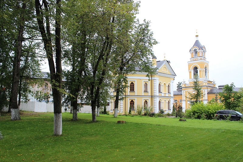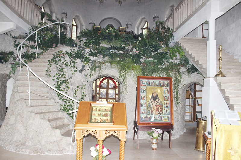 Даже внутреннее убранство одного из храмов Спасо-Вифанской обители – Преображенского – напоминает пещеру. Да-да, я ничего не выдумываю, престол нижнего храма в честь воскрешения Лазаря устроен в алтаре, а обращенная к молящимся стена в середине храма имеет вид искусственной пещеры. А над ней возвышается алтарь верхнего храма в честь Преображения Господня, наподобие вида евангельской горы Фавор. Сегодня она украшена цветами и декоративными кустарниками.