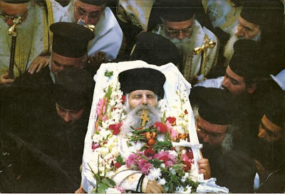Отпевание проходило под открытым небом, и после проповеди митрополит Кефаллинийский Прокопий попросил поднять тело выше, чтобы верующие увидели старца. Как только показались мощи, в один голос тысячи верующих закричали: «Святой, святой».