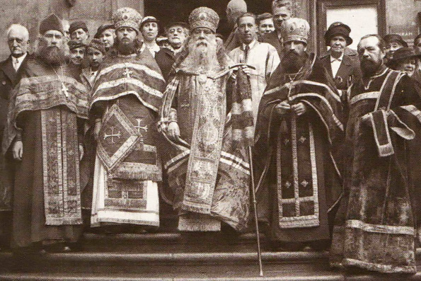 Владыка Сергий в центре, слева архимандрит Исаакий (Виноградов) у храма святителя Николая в Праге, 1940 год «Увеличил количество верующих в храмах Казани»