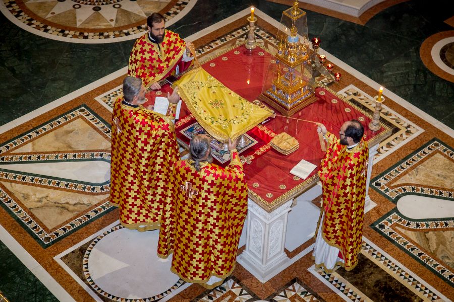 Након Светог Причешћа свештенство Саборног храма је пререзало и освештало славски колач заједно са вјерним народом, дјецом и члановима храмовног хора “Свети Апостол и Јеванђелиста Марко који је управо овом приликом прославио своју крсну славу – празник Светог Јована Дамаскина, као и јубилеј – 25. година постојања.