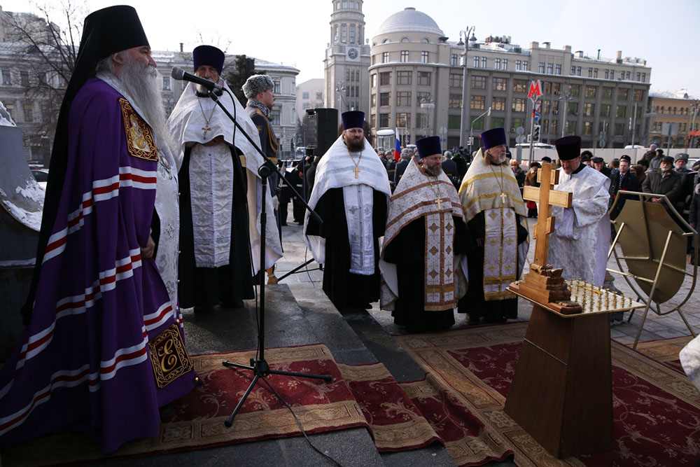 Литию совершил управляющий Юго-Западным викариатством епископ Дмитровский Феофилактв сослужении настоятеля часовни протоиерея Александра Салтыкова, представителя Синодального отдела по взаимодействию с Вооруженными силами и правоохранительными органами протоиерея Александра Добродеева и духовенства Иверского благочиния Центрального викариатства Московской городской епархии.