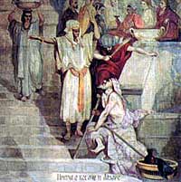 Кто же этот злополучный богач, роскошный весельчак, наследовавший вечную муку? Судя по тому, что он называет Авраама отцом и что ему и братьям его были известны писания Моисея и пророков, следует полагать, что богач был еврейского рода и закона, потомок Авраама. В чем состоял его грех, его вина, за которую он столь нечаянно попал в ад? В Евангелии сказано, что он был богат; но, без сомнения, не богатство было причиной столь ужасного мучения, которое испытывал богач в аду, – и Авраам был в свое время очень богатый человек, но богатство не помешало ему быть другом Божиим, потому что он был странноприимец и гостеприимен и был во всем верен и послушен Богу. Сказано дальше, что он одевался в порфиру и виссон — значит, чисто по-царски — и каждый день пиршествовал блистательно. Казалось бы, и в этом нет особенной вины его; богатому человеку, у которого тысячи и, может быть, миллионы денег и огромные поместья, отчего не рядиться в шелк и бархат, да в нынешнее время это и не считается особенной роскошью, хотя виссон в то время был особенно дорог.