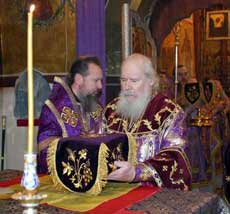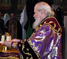 За малым входом литургии Патриарх Алексий наградил исполняющего обязанности наместника Саввино-Сторожевского монастыря игумена Савву (Фатеева) правом ношения палицы и наперсного креста с украшениями.