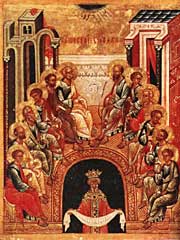 Итак, Единородный Сын Божий, исполнив Отеческое дело, восходит на Небеса, а Дух Святый нисходит: не иной Бог (да не будет!), — но иной Утешитель, как написано. О, неизреченное человеколюбие! Сам Бог соделался Утешителем нашим. Так Он, подлинно, утешает отягченных несчастиями, предохраняя их от изнеможения духом, как свидетельствует об этом святой Апостол, говоря: внеуду брани, внутрьуду боязни, но утешаяй смиренныя, утеши нас Бог… (2 Кор. 7, 5). Он утешает устрашенное демонскими страхованиями сердце, возводя его через дерзновенное упование к непобедимому мужеству, как свидетельствует святой Давид: «яко Ты, Господи, помгл ми, и утешил мя еси» (Пс. 85, 17). Он утешает, воодушевляя мятежный ум, что ему дан был пир с Богом и покой, как свидетельствует Апостол, говоря: по Христе молим, яко Богу молящу нами; молим по Христе, примиритеся, т. е. имейте мир, с Богом (2 Кор. 5, 20).