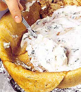 Творог, сметану и хрен смешать, добавить порубленную зелень укропа. Смесь слегка взбить. Шпинат промыть, высушить бумажными салфетками, порезать, удалив стебли. Нарезать шампиньоны пластинками. На сковороде растопить сливочное масло, обжарить шпинат в течение 1 мин. Всыпать шампиньоны и обжаривать смесь не более 5 мин.