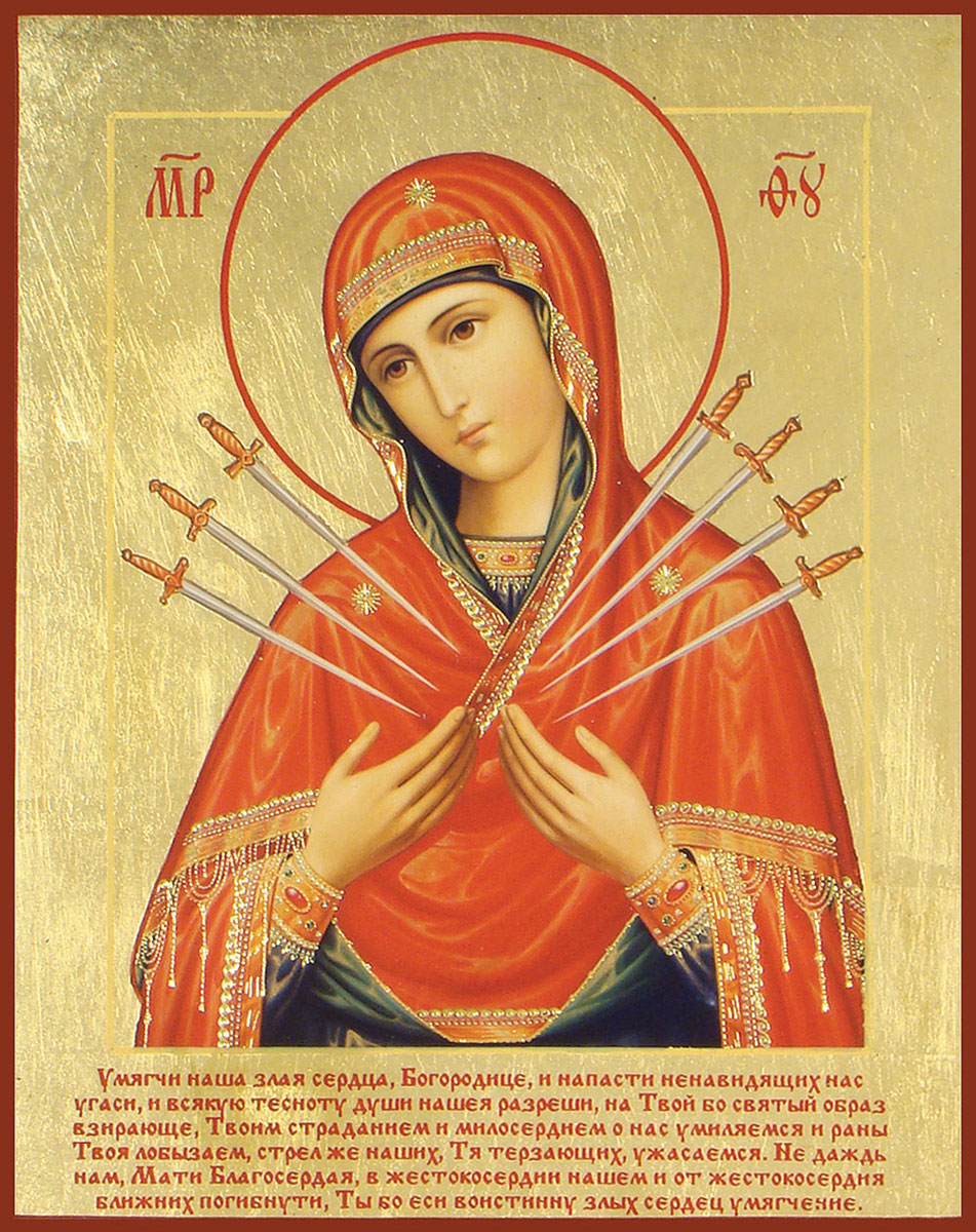 Эту икону называют еще «Симеоново проречение». Как повествует евангелист Лука, праведному старцу Симеону Богоприимцу было предсказано Духом Святым, что не умрет он, пока не увидит Мессию. И вот когда родители на сороковой день после рождения Младенца принесли Его в Иерусалимский Храм, пришел туда «по вдохновению» и Симеон, взял Младенца на руки (откуда и прозвание Богоприимец) и произнес знаменитые слова, которыми с тех пор завершается каждая служба вечерни и известные как Молитва святого Симеона Богоприимца: «Ныне отпущаеши раба Твоего, Владыко, по глаголу Твоему, с миром…» После же он благословил святого Иосифа и Пречистую Матерь Спасителя и обратился к Марии с тем самым Симеоновым проречением: «се, лежит Сей на падение и на восстание многих в Израиле и в предмет пререканий, — и Тебе Самой оружие пройдет душу, —да откроются помышления многих сердец». Подобно тому как Христа пронзят гвоздями и копием, так и душу Пречистой поразит некое «оружие» печали и сердечной боли, когда узрит Она страдания Сына; после же откроются скрытые доселе помышления (о Мессии) людей, которым предстоит сделать выбор: с Христом они или против Него. Такое толкование Симеонова пророчества и стало предметом нескольких «символических» икон Богородицы. Все прибегающие к ним с молитвою чувствуют, что при умягчении сердца облегчаются страдания душевные и телесные, и сознают: когда молятся пред этими образами за врагов своих, тогда смягчаются их враждебные чувства, уступая место милосердию, утихают междоусобная брань и вражда.