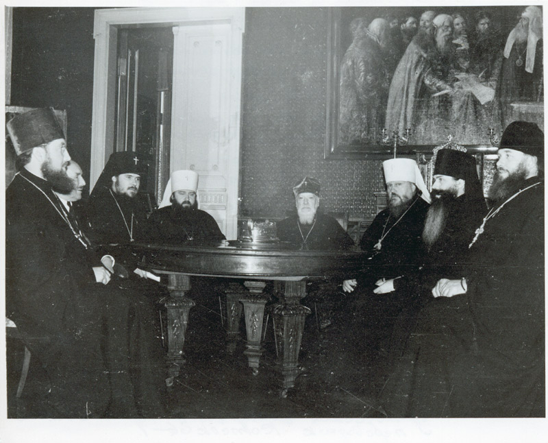 Слева направо: профессор Московской духовной академии протоиерей Алексий Остапов; архиепископ Таллинский и Эстонский Алексий (будущий Патриарх Московский и всея Руси); митрополит Ленинградский и Ладожский Никодим; Патриарх Московский и всея Руси Алексий I; митрополит Крутицкий и Коломенский Пимен (будущий Патриарх Московский и всея Руси); епископ Волоколамский Питирим; архимандрит Платон (Лобанков), наместник Троице-Сергиевой лавры. Сентябрь 1964 года. В Синодальном зале Московской Патриархии