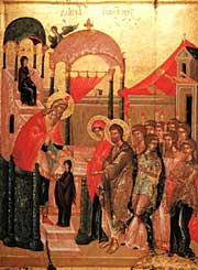 Днесь благоволения Божия предображение и человеков спасения проповедание, в храме Божии ясно Дева является и Христа всем предвозвещает. Той и мы велегласно возопиим: радуйся, смотрения Зиждителева исполнение.