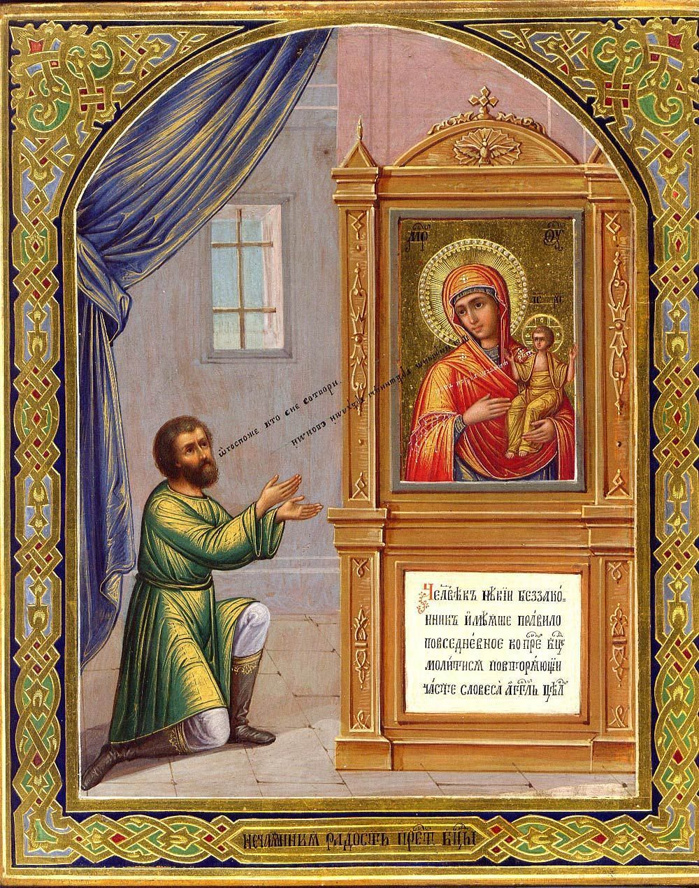 Согласно этому преданию на иконе «Нечаянная Радость» и пишется «человек некий беззаконный», молящийся на коленях пред образом «Одигитрии», под которым обычно начертаны первые слова самого повествования или же особая молитва.