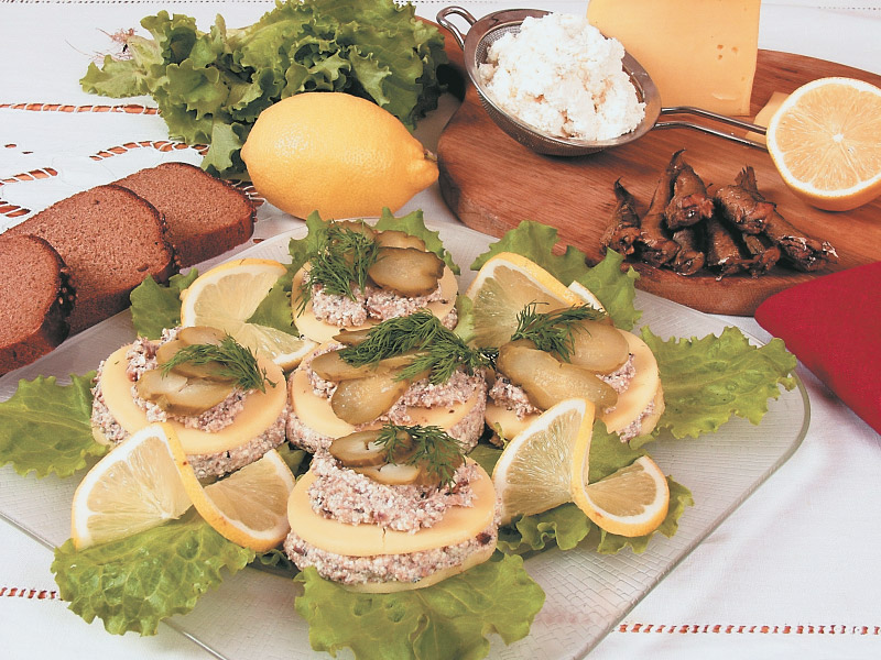 300 г твердого сыра, 200 г творога, 1 банка шпрот, 50 г сливочного масла, маринованные грибы и огурцы.