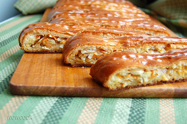 Если кулебяка испечена за день-два до приема гостей, ее следует перед подачей на стол разогреть и только тогда нарезать.