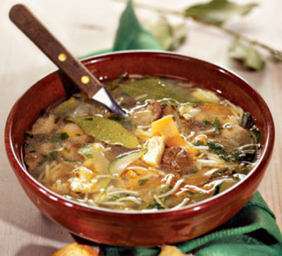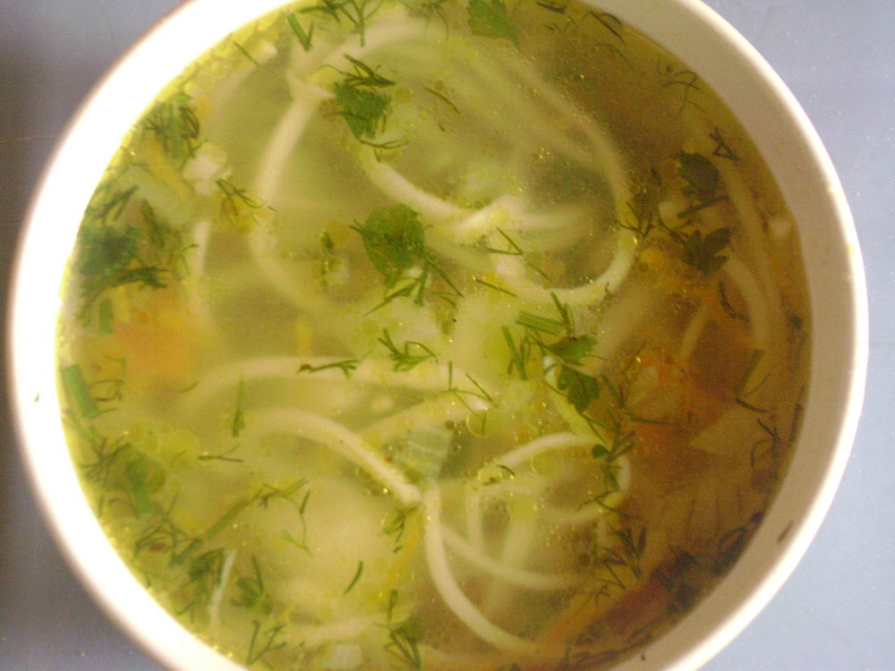 Сделайте в горке просеянной муки углубление, вбейте в него яйца, добавьте воды и замесите крутое тесто. Разделите его на две части, каждую раскатайте так тонко, чтобы сквозь нее просвечивалась доска. Когда тесто подсохнет, посыпьте его мукой, скатайте в рулет и нарежьте поперек на тонкие (шириной 1 см) полоски. Перед подачей на стол отварите лапшу в большом количестве подсоленной воды. Когда лапша закипит и всплывет, откиньте ее на дуршлаг, промойте горячей водой, выложите в кастрюлю, добавьте столовую ложку сливочного масла и перемешайте.