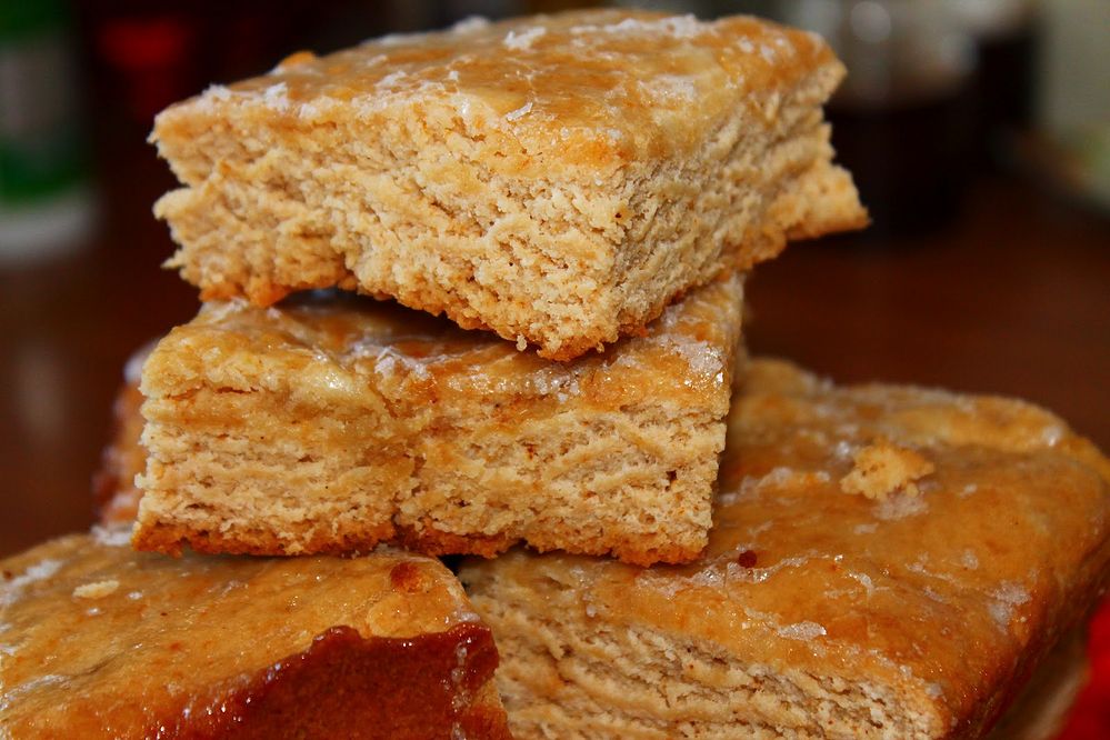 Маргарин порубите с мукой, добавьте сахар, растопленный мед с пряностями, 1 яйцо, 1 желток, соду, влейте кофе и замесите тесто. Затем разделите его на две части и раскатайте лепешки. Одну выложите на застланный промасленной бумагой противень, наколите ее вилкой, смажьте джемом, посыпьте дроблеными орехами, промытым изюмом, нарезанным инжиром и цукатами, накройте другой лепешкой, которую также наколите вилкой. Смажьте белком и выпекайте при температуре 180 °С в течение 40 мин.