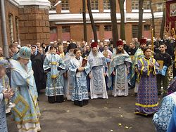 Уже стало доброй традицией на праздник Покрова отмечать усердные труды тех, кто особенно старается ежедневно жертвенно служить своим ближним, оказавшимся в темницах и узах. Владыка Александр приветствовал Владимира Анатольевича Давыдова – начальника Управления Федеральной службы исполнения наказаний России по городу Москве: Святейший Патриарх Московский и всея Руси Алексий II, «во внимание к трудам на ниве духовного просвещения заключенных», наградил В.А. Давыдова орденом равноапостольного князя Владимира 3-й степени.