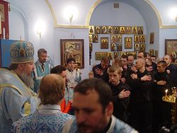 И вот началось богослужение. Храм был полон, он вместил более 100 человек, около половины из них составляли насельники Бутырки. Они резко выделялись среди гостей своей черной одеждой, худым жилистыми телами, бледной кожей лица и грустным выражением глаз.