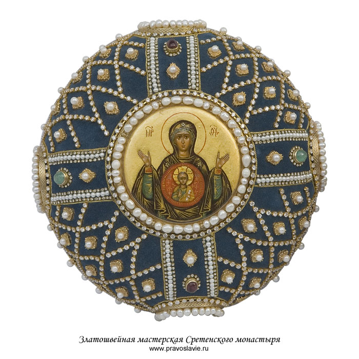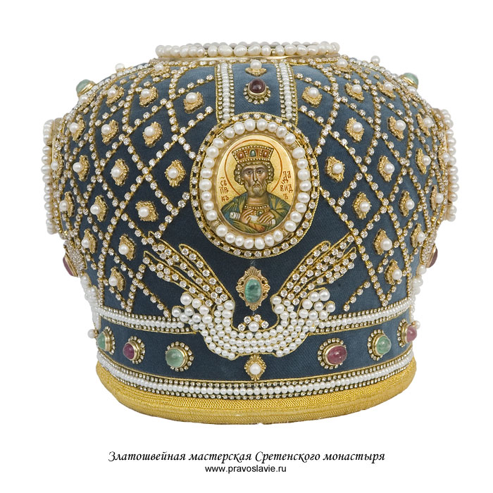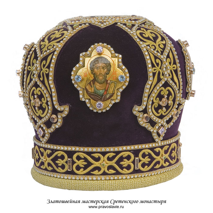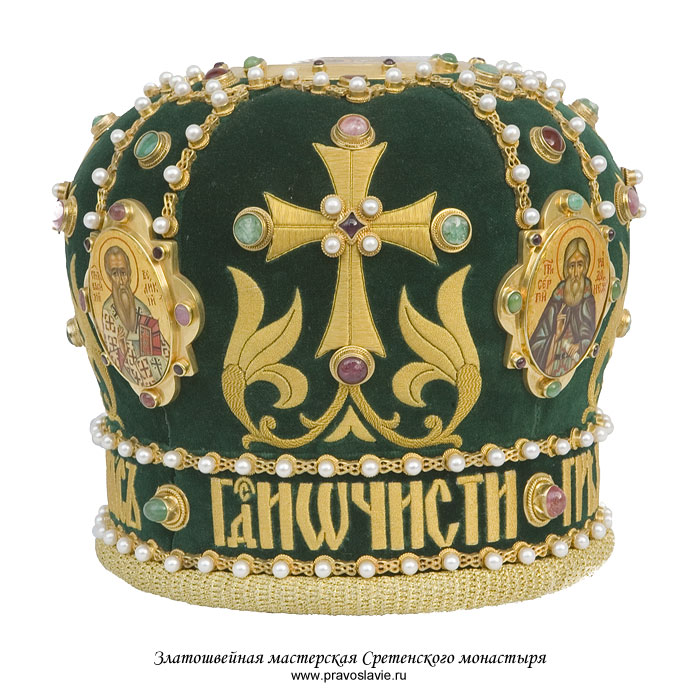 | Митра. Москва, мастерская Сретенского монастыря. 2006 год. Бархат, стразы, жемчуг, серебро, драгоценные и полудрагоценные камни. Ткачество, шитье, золочение, живопись. Из ризницы Сретенского монастыря. | |||