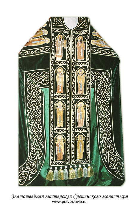 | Иерейское облачение (фелонь, епитрахиль, палица, набедренник, поручи, пояс). Москва, мастерская Сретенского монастыря, 1995 год. Бархат, парча, шелковые, пряденые и сканные золотные нити, жемчуг, кисти. Ткачество, шитье. Из ризницы Сретенского монастыря. | |