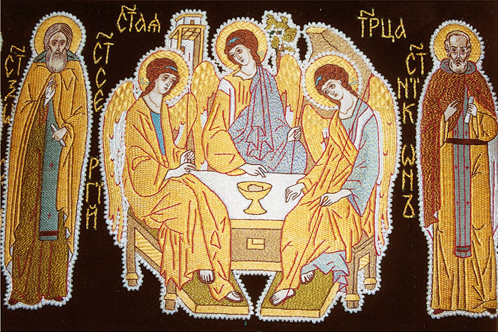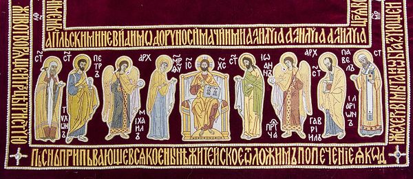 | Подвесная пелена. Москва, мастерская Сретенского монастыря, 1998 год. Бархат, шелковые, пряденые и сканные золотные нити, жемчуг, кисти. Ткачество, шитье. Из ризницы Сретенского монастыря. | ||