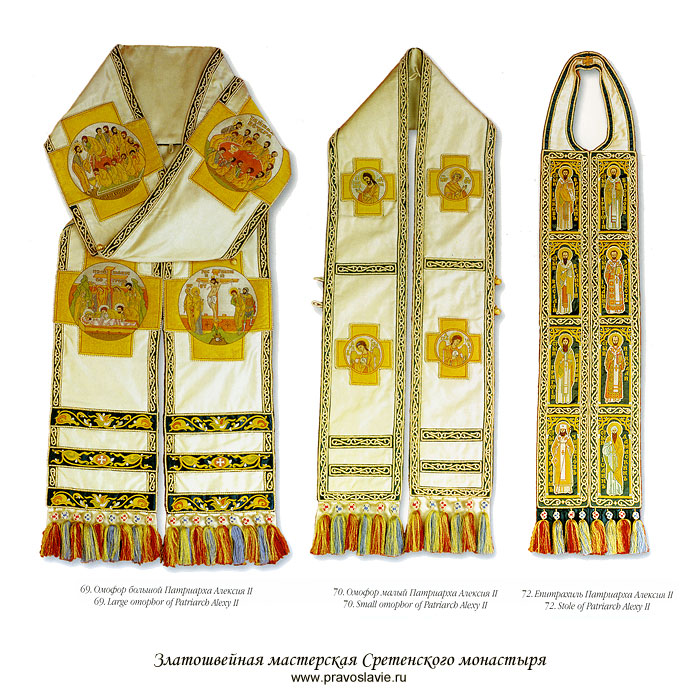 | Архиерейское облачение Патриарха Алексея II. Саккос, большой омофор, малый омофор, палица, епитрахиль, поручи, пояс. Москва, 1998-2000 гг. Из ризницы Патриарха Московского и всея Руси Алексея II. Атлас, шелковые, пряденые и сканные золотные нити, жемчуг. Ткачество, шитье, низание | ||