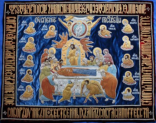 | Плащаница. Москва, мастерская Сретенского монастыря, 2009 год. Бархат, шелковые, пряденые и сканные золотные нити, жемчуг, драгоценные камни. Ткачество, шитье. Из ризницы храма Преображения Господня в Переделкино. | ||