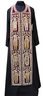 | Иерейское облачение (фелонь, епитрахиль, палица, набедренник, поручи, пояс). Бархат, парча, шелковые, пряденые и сканные золотные нити, жемчуг, драгоценные камни, кисти. Ткачество, шитье, низание. 2012 г. | ||
