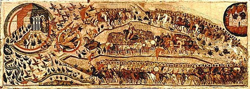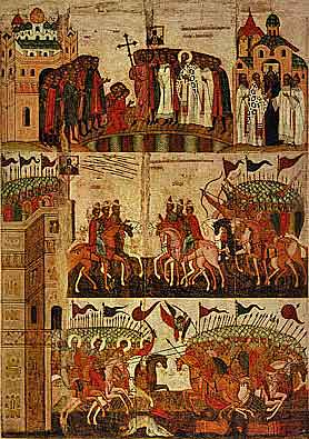 Еще более насыщена христианскими мотивами основная редакция "Сказания о Мамаевом побоище". Услышав о нашествии Мамая,[13] князь Димитрий сначала молится перед своей домашней иконой: "И ставъ предъ святою іконою Господня образа, яже въ зглавiи его стояще и, падъ на колену свою, нача молитися" (Повести 1959:47). Еще до начала сражения он хочет пострадать за веру Христову, при этом пострадать даже до смерти (Повести 1959:251,298). Общеизвестен факт поездки князя в монастырь: Димитрий "поеде къ Жывоначальной Троици на поклонъ къ отцу своему преподобному старцу Сергiю благословенiа получити от святыа тоа обители" (Повести 1959:251). Прп. Сергий призывает князя на Литургию, дает ему освященную просфору, окропляет князя и приближенных его святой водой, а инокам Пересвету и Ослябе дает оружие нетленное – крест (здесь опять возникает мотив контаминации креста и меча при защите Христианства). Возвратясь в Москву, великий князь молится в Успенском соборе сначала перед иконой Спасителя, потом перед иконой Владимирской Богоматери[14] и у раки с мощами свт. Петра Московского чудотворца (Повести 1959:253,300). В Архангельском соборе князь взывает к Богу перед иконой архангела Михаила (Повести 1959:254,301). Будучи уже на Непрядве князь и воеводы "взьехавъ на высоко место и увидевъ образы святыхъ, иже суть въображени въ христiаньскыхъ знаменiихъ, акы некiи светильници солнечнiи светящеся въ время ведра" (Повести 1959:62). Там князь слез со своего коня и "паде на колени свои прямо великому пълку чернаго знаменiа, на немъ же въображенъ образъ Владыкы Господа нашего Исуса Христа" и начал молиться (Повести 1959:264,312; ср.188). Князь Дмитрий многократно призывает на помощь свв. Бориса и Глеба (Повести 1959:265,272,273,305,314,321,323,328,329), а перед самым сражением он молится перед крестом (Повести 1959:267). Очень показательно, что князь Дмитрий сравнивается с Константином Великим, с царем Давидом, с Александром Македонским, с Гедеоном (Повести 1959:263). Если в других произведениях цикла князь призывает умереть за Христианство, за святые церквии, то здесь на первое место выходит князь, и его соратники говорят, что они готовы головы свои положить "за тебе, Государя, и за святыа церкви и за провославъное христiанство" (Повести 1959:67). И далее в Повести соратники князя готовы смертью умереть "за святую веру христианскую", они кладут головы "за святые церкви и за православное христианство" (Повести 1959:269,274). А при возвращении с битвы уцелевшие воины поют псалмы, а также тропари мученикам и богородичны.