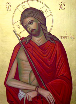 На главу Иисуса надели сплетенный из терна венец, шипы которого изъязвляли голову Узнику. Особенно болезненно впивались иглы, когда воины били Его тростью по голове. С этим соединялись моральные страдания. Воины глумились и надругались над Тем, Кто вмещал в Себе полноту любви ко всем людям и даже к этим, ослепленным грехом истязателям, не ведавшим, что творят. Окровавленного Христа в терновом венце и багрянице Пилат вывел к иудеям и сказал, что не находит в Нем никакой вины. «Се, Человек!» (Ин. 19, 5), — произнес прокуратор. В этих словах игемона видится желание вызвать у иудеев сострадание к Узнику и отвести от Него смерть. Возможно, он хотел сказать: «Этот беспомощный Человек не похож на царя и не представляет угрозы кесарю». Но как нередко бывает, люди, соучаствующие в великих священных событиях, несмотря на всю свою слабость и немощь, становятся орудиями Божественного Промысла и выражают сокровенные истины, не ведая того. Слова «се, Человек!», сказанные римским судьей в момент искупительных страданий Иисуса, могут быть поняты в сопоставлении со стихами 21-го мессианского псалма. В нем святой пророк Давид пророчески от лица претерпевающего муки Спасителя молится Богу Отцу: «К Тебе воззваша, и спасошася, на Тя уповаша и не постыдешася. Аз же есмь червь, а не человек, поношение человеков и уничижение людей» (Пс. 21, 5-6).