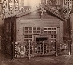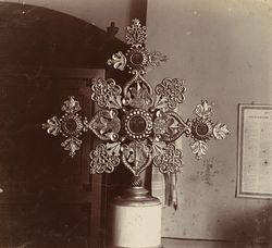 | Запрестольный крест в старой Успенской церкви, подаренный царем Алексеем Михайловичем. Фото С.М. Прокудина-Горского, восстановлено С.О. Прохоровым. http://ps-spb2008.narod.ru/tv_kashin1.htm |