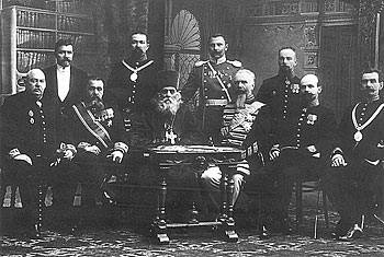 | Кашинская депутация, представляющаяся государю императору 29 октября 1908 года, с ходатайством о восстановлении прославления благоверной великой княгини Анны. Сидят слева направо: Д.И. Манухин, В.П. Кисловской, священник И.А. Аменитский (настоятель собора), Б.В. Штюрмер, Н.А. Пономарев (предводитель Кашинского дворянства), А.И. Лядов. Стоят: П.Н. Захаров, А.П. Дорогутин (городской голова), Л.Я. Лихачев, князь А.В. Оболенский. Фото предоставлено Н. Быковской |