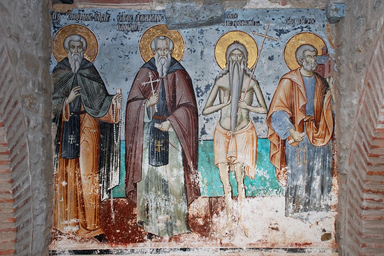 | Преподобные Евфимий Иверский, Афанасий Афонский, Петр Афонский и святой апостол Петр. Фреска в Карее. Фото: А.Поспелов / Православие.Ru |