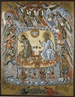 Совмещая оба способа толкования, святитель не всегда следует строгой логике. Так, только лишь совершились действия, символизирующие Воплощение, и вот уже «восхождение епископа на трон и благословение народа означает, что Сын Божий, завершив свои спасительные дела, воздевает руки и благословляет Своих святых учеников, говоря: “Мир Мой оставляю вам”». Когда епископ садится, этим он представляет прославление человеческой природы, воспринятой Богом Сыном, и принятие Богом Отцом жертвы Христовой. В то же время прокимен вновь возвращает нас к пророчествам Ветхого Завета о пришествии Христа, причем кадило (тогда каждение совершалось еще во время аллилуария) символизирует человеческую природу Христа, а огонь в нем – Божественную[18].