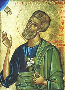 Праведный Иосиф был богатым и знатным членом синедриона из города Аримафеи (Рамафы). Он был тайным учеником Спасителя. О нем упоминают все четыре евангелиста. Хотя он и был членом синедриона, но не участвовал в «совете и деле» иудеев, вынесших смертный приговор Господу. После распятия и смерти Спасителя он дерзнул пойти к Пилату и просить у него тело Господа, которое и предал погребению при участии праведного Никодима, тоже тайного ученика Христа. Они сняли с Креста тело Спасителя, обернули плащаницей и положили в новом гробе, в котором никто ранее не был погребен (этот гроб святой Иосиф приготовил заранее для себя) в саду Гефсиманском, в пещере, вырубленной в скале. Тут же были Богоматерь и святые жены-мироносицы. Привалив тяжелый камень к двери гроба, они удалились. Святой Иосиф, по преданию, был одним из просветителей Англии и скончался мирно возле Гластонбери.