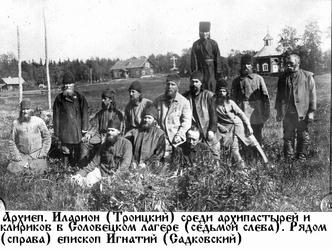 Сидят (слева направо): протоиерей Димитрий Федотьев, архимандрит Георгий (Садковский, будущий епископ), протоиерей Анатолий Авдеевич Правдолюбов; стоят (слева направо): иерей Николай Анатольевич, Анатолий Сергеевич и протоиерей Сергий Анатольевич Правдолюбовы. Перед заключением на Соловки, г. Касимов. 3 февраля 1930 года архимандрит Георгий особым совещанием приговорен к трем годам исправительно-трудовых лагерей, которые отбывал в Котласе, Усть-Выми, Ухте, Пинюге, Балахне; в декабре 1932 года был освобожден. В 1933 году был настоятелем Благовещенской церкви города Касимова Рязанской епархии. И здесь, как и в других местах своего служения, архимандрит Георгий пользовался глубоким уважением прихожан, клира, других священников. В особо дружеских отношениях отец Георгий находился с семьей Правдолюбовых, с которыми поддерживал отношения и позже (отец Анатолий Правдолюбов в молодости был иподиаконом у владыки Георгия (Садковского). Твердая вера, бесстрашность, самоотреченность отца Георгия возрождали дух в православной пастве, показывая, что Церковь жива не только когда ей способствует власть, но и когда она гонима властью, а ее служители преданы Богу, несмотря на гонения, угрозы, лишения.