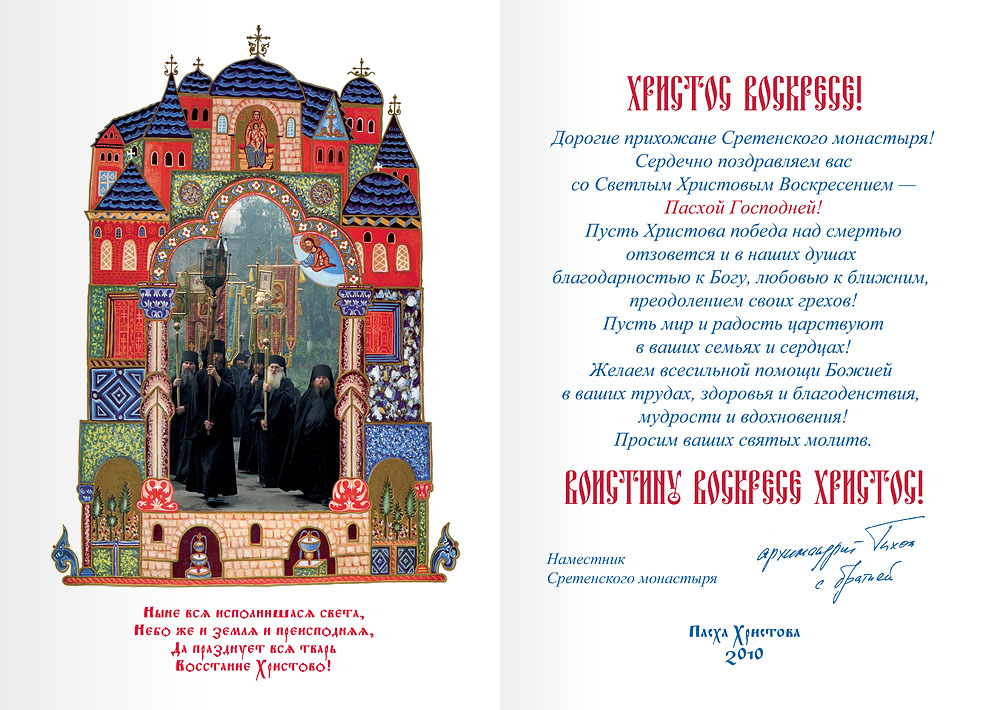Сердечно поздравляем вас со Светлым Христовым Воскресением — Пасхой Господней! Пусть Христова победа над смертью отзовется и в наших душах благодарностью к Богу, любовью к ближним, преодолением своих грехов! Пусть мир и радость царствуют в ваших семьях и сердцах! Желаем всесильной помощи Божией в ваших трудах, здоровья и благоденствия, мудрости и вдохновения! Просим ваших святых молитв.