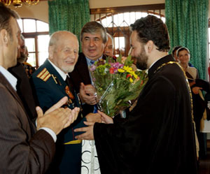 От лица всего собравшихся отец Даниил поздравил с Днем Победы единственного в Сергиевском приходе ветерана Великой Отечественной войны Валентина Павловича Аринина, который затем рассказал взрослым и детям о своем нелегком жизненном пути и вкладе в общее дело Победы.